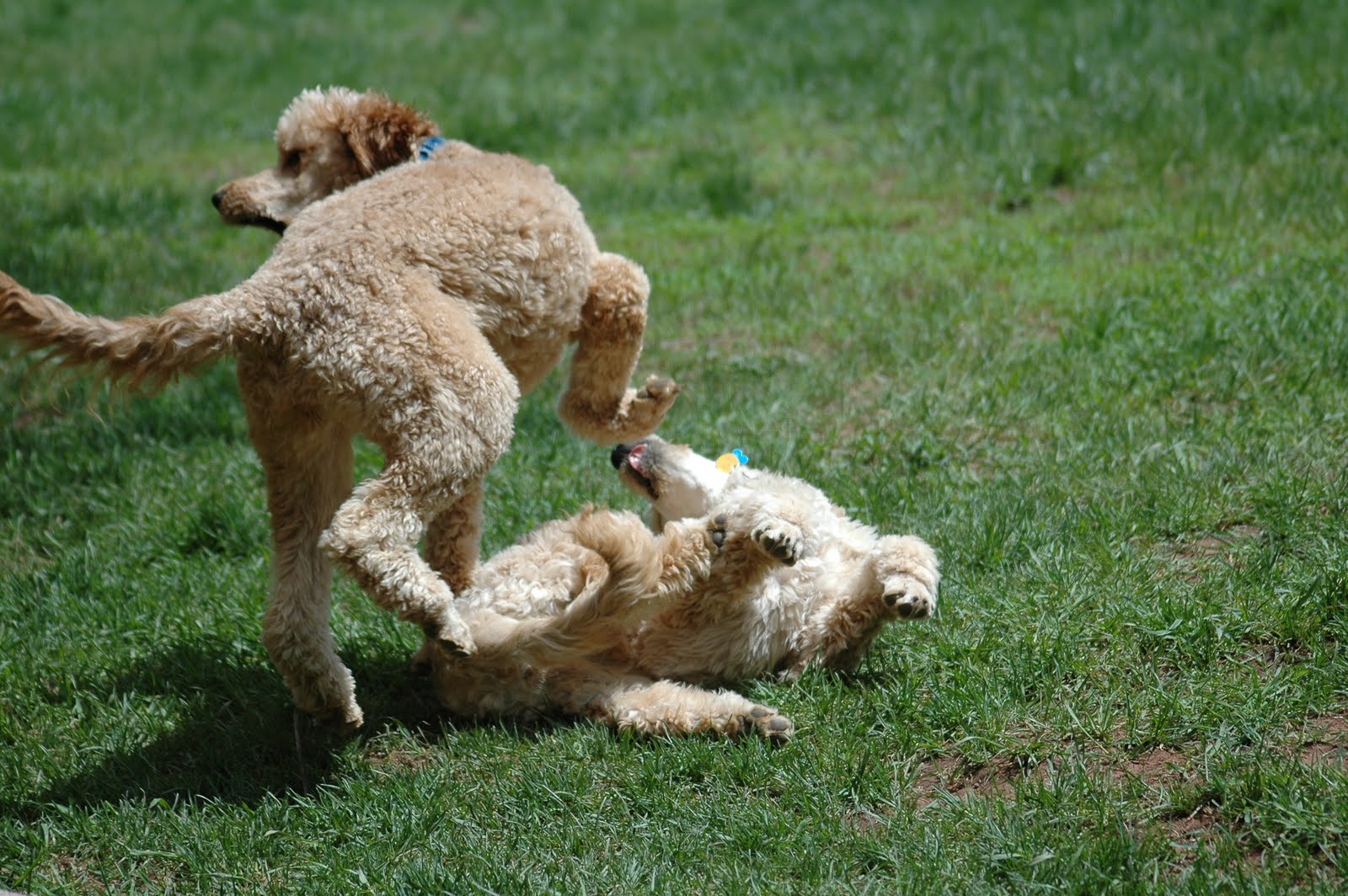 Actually, it was raining up until yesterday, so we engaged in a little surreptitious indoor wrestling. Surreptitious because Abby is supposed to be engaging in 'minimal activity' through this week. Uh-huh. She's a 6 month old Mutant Puppy. They don't make drugs strong enough to keep her down.
